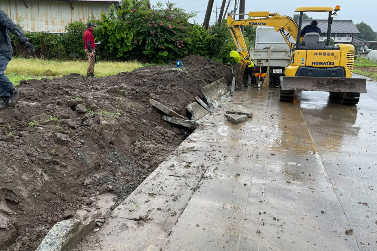 昨日より始まった、ハウスの建設工事が猛暑の中、急ピッチで進められています。2日目の今日は沓石(くついし)の埋設(?)工事が進められていました。工事が始まったばかりですが、完成が待ち遠しいです。